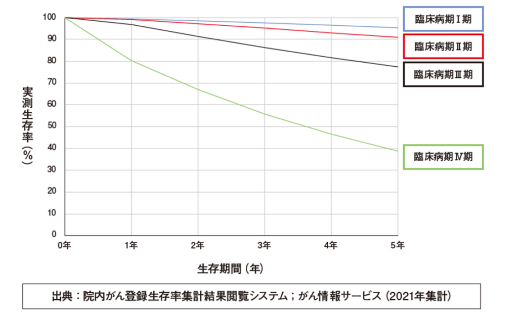 - Ⅳ期だと50%を切る。 この差を生むのが「検診」です。 我々が撮影するマンモグラフィで、石灰化や小さな腫瘤を見つけることが、患者さんを「青い線の人生」へと導くことになるのです。