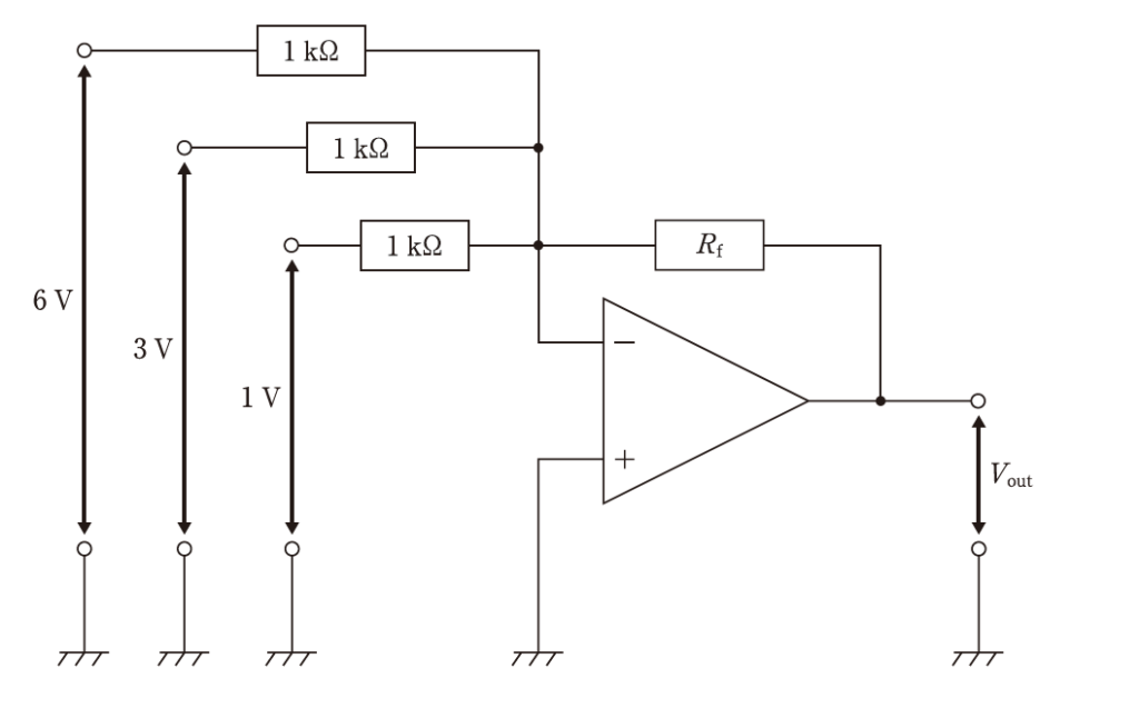 出力電圧 Vout が -10 V のとき負帰還抵抗 Rf [kΩ] はどれか。