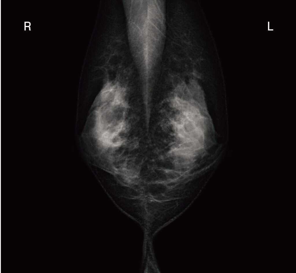 大胸筋がこのように斜めに広く写るのは「MLO(内外斜位方向:Mediolateral oblique)撮影」の特徴です。