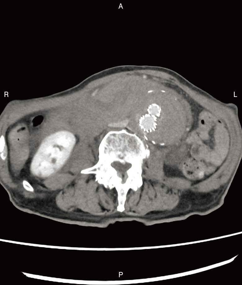 ※ちなみに、真ん中にある2つの極端に白いリング状の構造物は「ステントグラフト(人工血管)」です。この患者さんは過去に大動脈瘤の治療を受けていたものの、何らかの原因で再び圧力がかかり、限界を迎えてしまった状態だと推測できます。