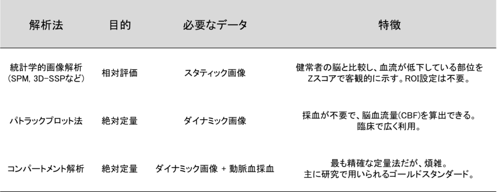 - コンパートメント解析:最も精確な絶対定量法だが、ダイナミック画像と動脈血採血が必要で煩雑。