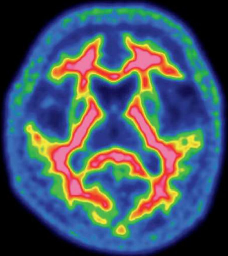 - 画像はアミロイドPETの正常像。使用薬剤はアルツハイマー病の原因物質を可視化する¹⁸F-フルテメタモルである。