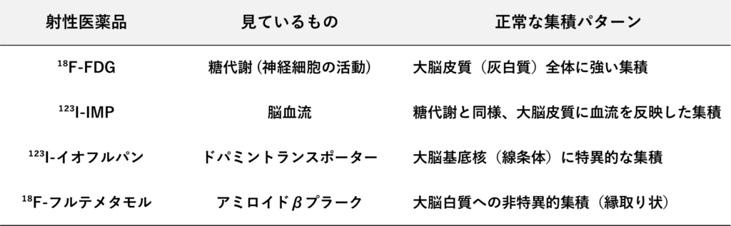 ✔ 脳核医学検査:「何」を見ているかで薬剤を区別する 🧠