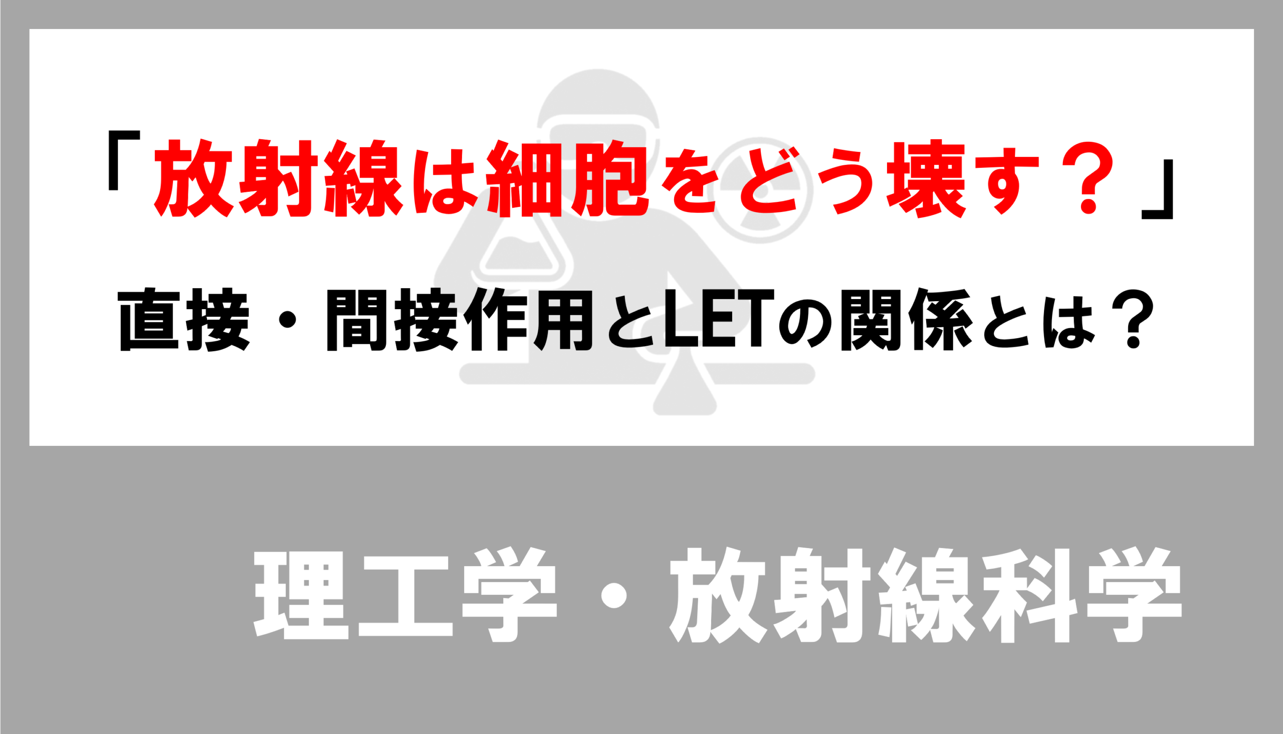どちらの作用が起こりやすいかは、放射線の種類、すなわちLET(線エネルギー付与)によって決まります。LETとは、放射線が物質の中を進むときに、通り道にどれだけエネルギーを密集して置いていくかを示す指標です。