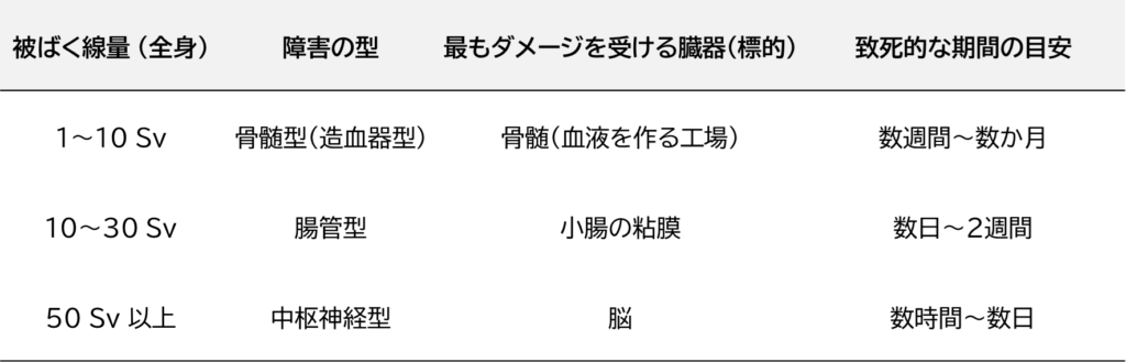 - 骨髄型 (~10 Sv) → 週~月単位 🩸