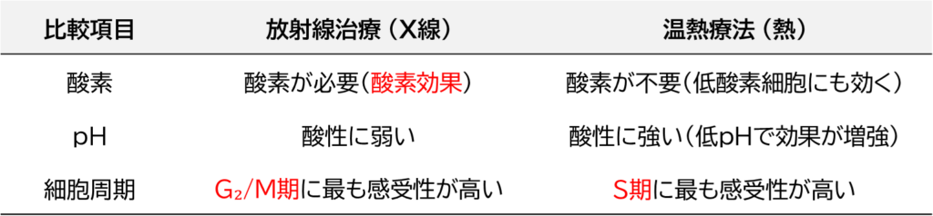 放射線治療の最大の弱点は、腫瘍の中心部にありがちな「低酸素」「低pH(酸性)」「S期の細胞」には効きにくいことじゃ。 驚くべきことに、温熱療法は、これら放射線が苦手とする3つの環境すべてで、逆に高い効果を発揮する。