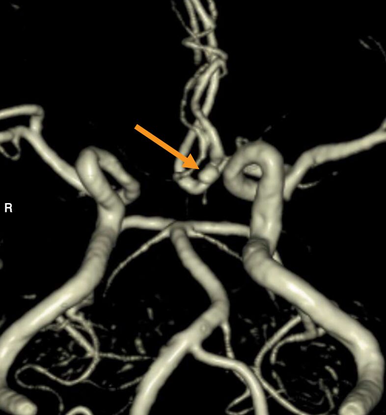 今回の画像では、まさにこの典型的な位置、左右の前大脳動脈の合流点に瘤状の膨らみ(動脈瘤)が認められます。