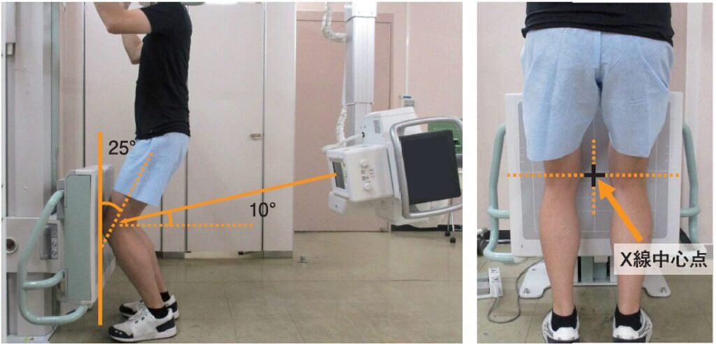 写真を見ると、患者さんは「立ったまま(荷重)」、膝を少し「曲げて(屈曲)」います。まるでスキーのジャンプ姿勢のようなこの独特なポーズ。 これが、Rosenberg(ローゼンバーグ)法です。